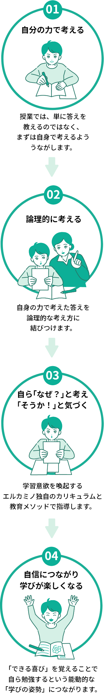 論理思考力を持つようになると生徒には「なぜ?」と自ら考え、「そうか!」と自らが気づくという『学びのスタイル』が生まれます。そのスタイルは「できた!」「わかった!」という喜びを生み出すのです。